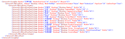 WebUI Studio提供了丰富的界面控件,包括用于数据呈现的Grid以及用于数据编辑的各种编辑器。我们只需将所需的控件从工具箱中拖拽到相应的界面即可。比如我们要实现订单数据的呈现,我们只需在页面中UXGridView控件,并对其添加所要显示的列并设置Binding属性实现数据的绑定,如下图所示: