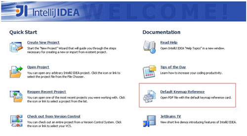 打开IntelliJ后,进入欢迎页面,或者项目页面,这里可以直接查看IntelliJ的默认快捷键。如图中红框部分。