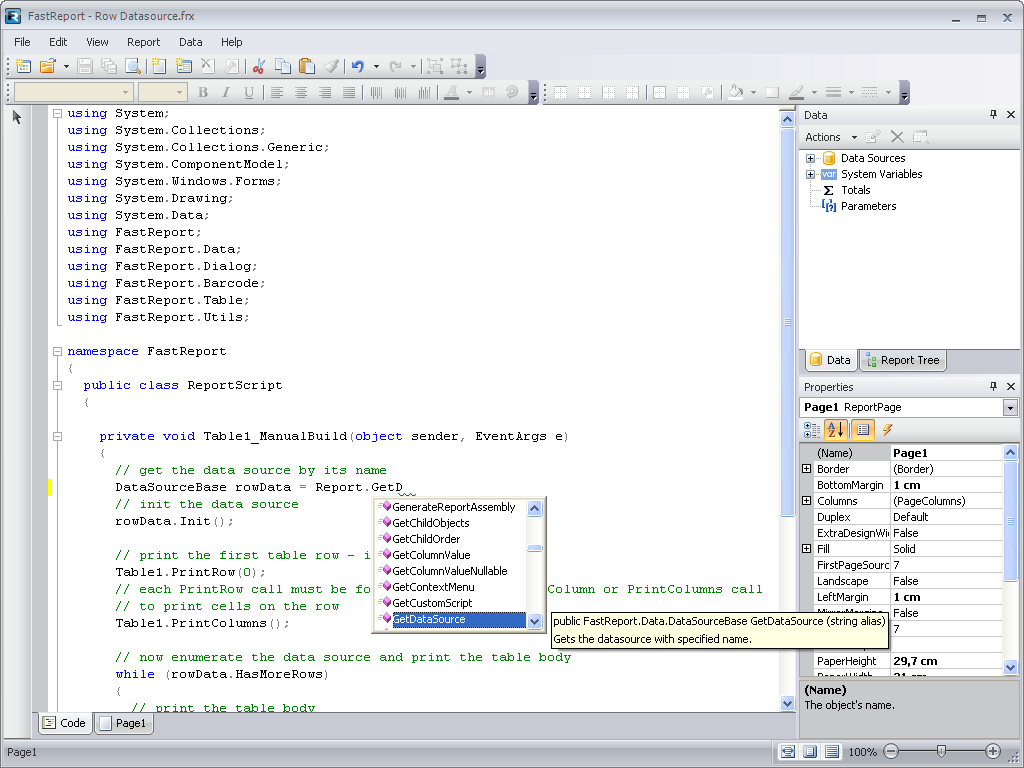 FASTREPORT.NET内置脚本引擎,支持C# 和VB.NET这两种.NET语言,您可以使用所有.NET脚本来执行复杂的数据处理,管理对话框等形式的交互活动。