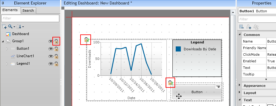 在Element Explorer中,你可以通过切换组项右边的锁图标,轻松锁定或解锁某个组(以及它里面的所有控件)。当某个组被锁定时,你不能在画板上移动这个组,这可以防止意外更改了已经完成的仪表盘控件。