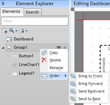 在仪表盘设计画板上,你可以将两个或两个以上的元素/控件组合起来,这需要你熟练地应用某些分组操作。例如,你可以通过拖拽将一个组重新定位,或者用Z轴排序让控件组向前或向后。这后一种用法类似于设计上的“图层”概念。
