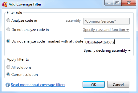dotCover 2.0可以过滤特定属性的代码。不仅如此,还有一个对话框用来管理覆盖和属性过滤。