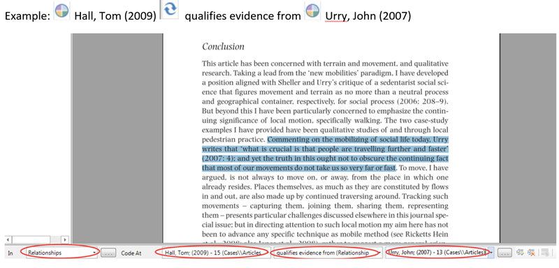 从下面的Network Sociogram中可以看出,Hall(2009)和Urry(2007)之间有四种关系,当我双击该线时,弹框会打开,向我展示这四种关系是什么。如果我选择任意一个并点击确定,带有详细信息的参考文章将在视图中打开,如下图所示: