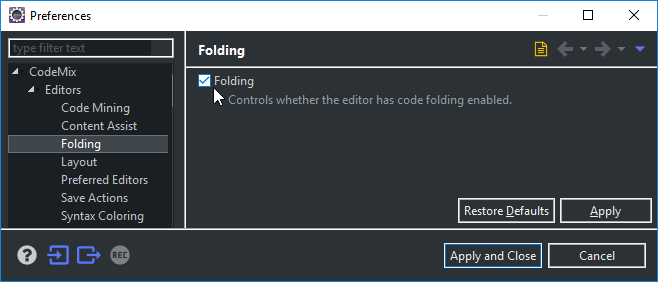 默认情况下启用代码折叠。要更改此参数,请转到Preferences > CodeMix > Editors > Folding。