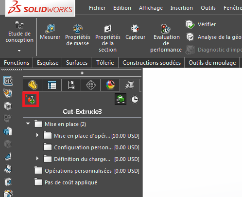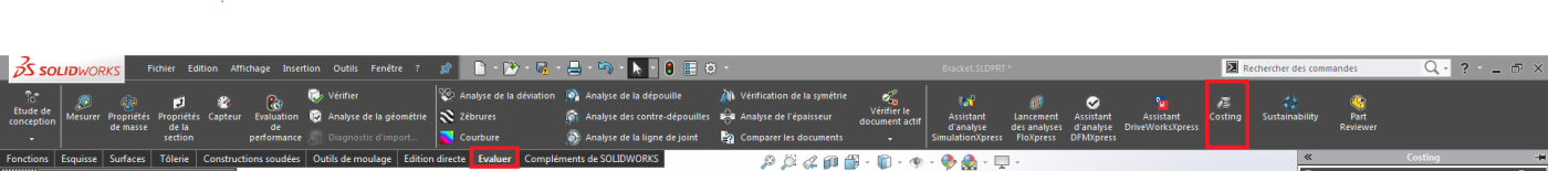 首先,成本核算模块位于SolidWorks的“评估”选项卡中。启动后,成本核算模块将在界面右侧启动。我们将通过一个示例向您展示该模块的实用性。我们将估算通过机械加工制造的钢制零件的成本。