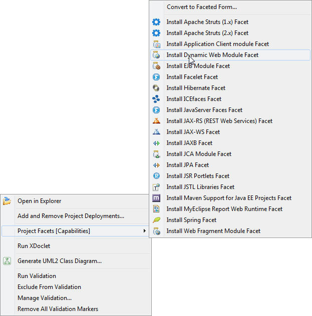 1、右键单击要配置的Java项目,从菜单中选择MyEclipse > Project Facets > Install Dynamic Web Module Facet。