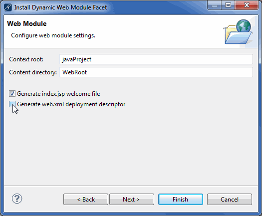 4、选择创建web.xml复选框来创建此部署描述符。如果项目在现有的WEB-INF文件夹中已经包含一个web.xml文件,可以忽略此选项。