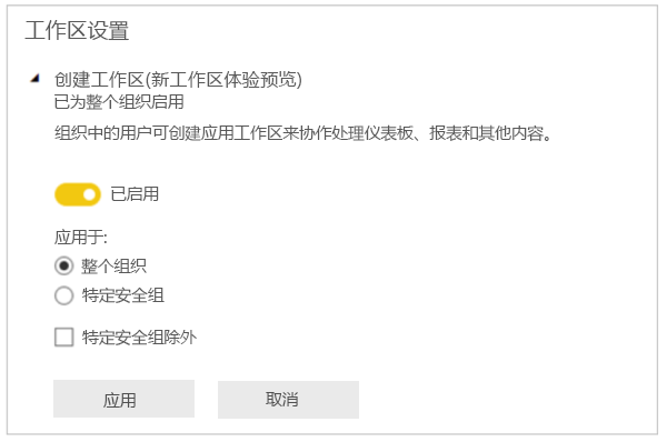 在管理门户的“工作区设置”中,管理员可以使用“创建工作区”(新工作区体验)设置,使组织中的每个人或没有人可以创建新的工作区体验工作区,还可以将创建限制为特定安全组的成员。