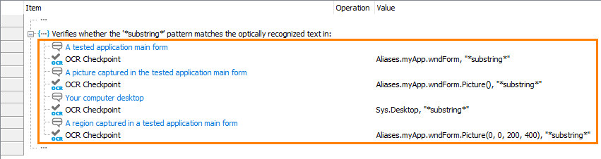 OCR.Recognize(Aliases.myApp.wndForm.Picture(0, 0, 200, 400)).CheckText('*substring*');C#Script