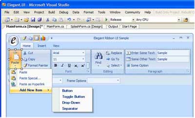 Elegant Ribbon is a set of Windows Forms controls that allow you quickly and easily provide your application with a new-generation user interface like that introduced in Microsoft Office 2007. It is written in 100% managed C# and is CLS compliant.