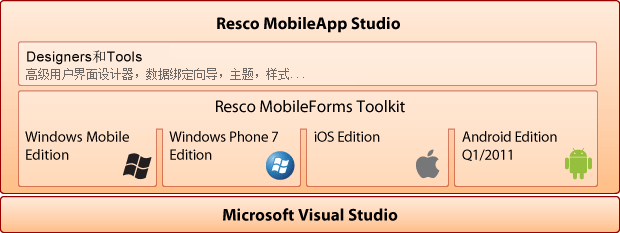 Resco MobileApp Studio是一个基于Microsoft Visual Studio的开发者平台,用于开发多种移动应用程序,并支持多种移动设备类型,如Windows Mobile, Windows CE,Tablet PC, Windows Phone7, iPhone,iPad和Android.它包含了针对WinForms, Silverlight, MonoTouch和MonoDroid的用户界面控件套包,以及其他高级的开发者工具,使得开发者能够快速的设计和创建移动表格。所有的控件和工具都能够集合到Microsoft Visual Studio中,开发者能够很容易的使用程序语言,如C#或Visual Basic.NET.进入到熟悉的开发环境中。