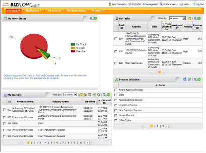 使用BizFlow用户们能够看到流程的状态:谁在做什么,做了什么,瓶颈出现在哪里,和瓶颈原因。管理人员可以了解到他们需要做什么来提高生产力。用户们可以更多的合作,因为他们能够即时的访问附件和意见以及知道哪里发生了特殊的路径改变。