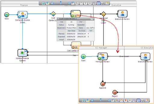 用户们能够建模流程和子流程。例如,用户们能够轻松地定义子流程,如质量评审中的所有的文档工作相关的前期起源和核保都是提供给工人和小组进行审核的。一个集体的和个人的批准/转交或拒绝/返工子流程能够通过一点和点击界面来定义。